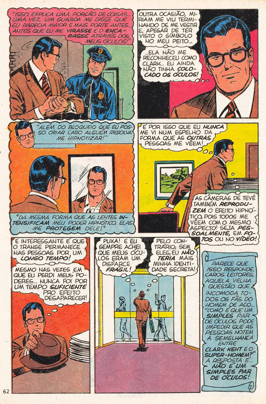 Bem, para começar, Clark é mais esperto que muita gente imagina. Quando ele está disfarçado de humano, ele não apenas muda suas roupas, mas todo seu comportamento, isso inclui sua expressão corporal. Ele tem um andar mais desleixado; sua postura é encurvada, dessa forma, ele aparenta ser menor e menos forte, já que seus ombros ficam caídos, escondendo seu peitoral. Há também o penteado: ele é dividido de forma diferente, para poder esconder o belo rosto do kryptoniano. E claro, há a parte do disfarce que as pessoas mais escolhem para zoar: os óculos. Na verdade, eles desempenham um papel de estrema importância. Além de mudar a cor de seus olhos, é por meio dele que Superman exerce seu poder de super-hipnotismo. E não inventamos isso. A própria DC já ofereceu essa justificativa na HQ Adventures of Superman #330 de 1939, nela, ele explica como consegue enganar as pessoas com essa habilidade.